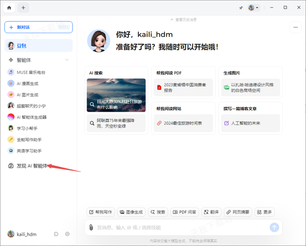 1.启动软件,点击左侧列表中的【发现AI智能体】选项,点击它。