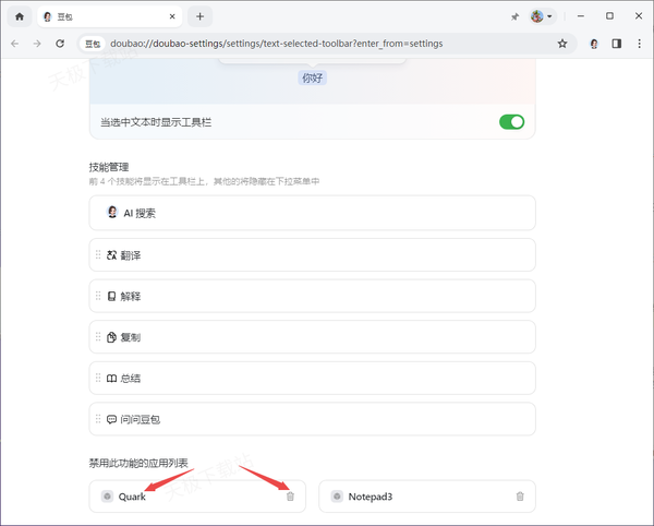 还是进入到豆包软件的【文本选择工具栏】的设置界面中,然后将界面滑动到最下面,此时大家就可以看到之前自己禁用该功能的软件列表了,直接点击软件右侧的【垃圾桶】删除图标,就可以取消该功能的禁用了。