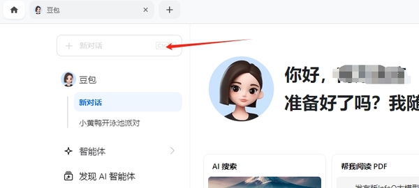 ①当我们在打开豆包,并成功登录豆包账号后,点击界面上方的【新对话】。