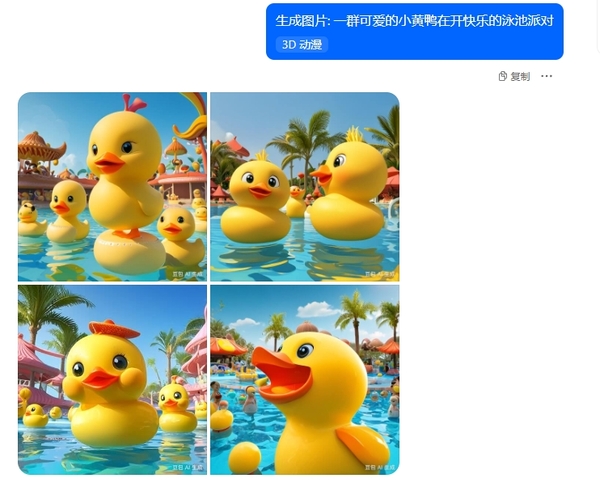 举个例子:就拿小黄鸭开泳池派对来说,如果我们想突出其中一只小黄鸭,那就可以添加一些描述,比如“让其中一只小黄鸭个头大一些”、“其中有一只小黄鸭戴着墨镜”、“有一只小黄鸭在朝其他伙伴喷水”等。