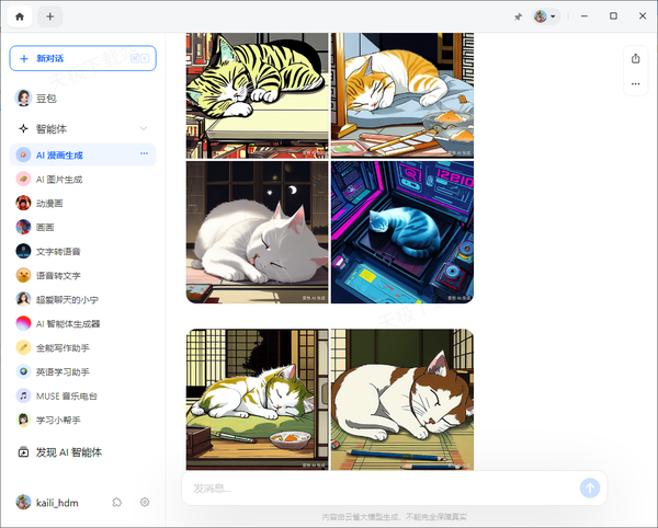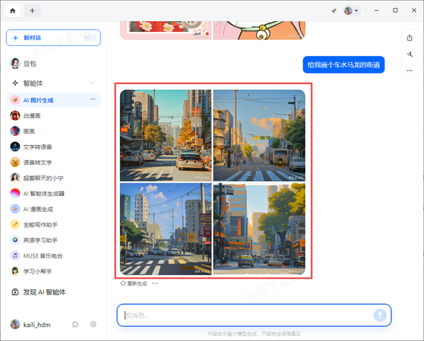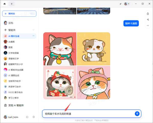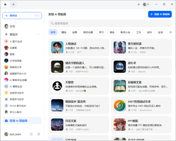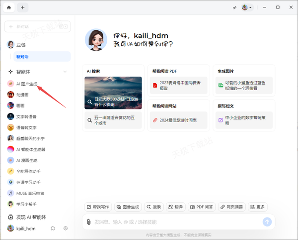 1、启动电脑端的豆包软件,然后在左侧的列表中找到【智能体】选项下的【AI图片生成】功能,点击它。