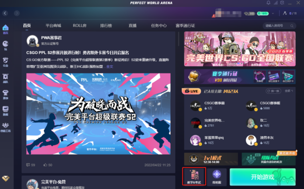 1、打开完美世界竞技平台,在首页的右下方,就可以看到一堆投掷物和【教学&考试】组成的按钮,点击即可进入投掷物练习区。
