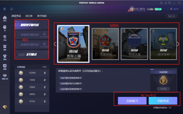 接下来是模式,分为练习模式以及考试模式,在练习模式中,我们可以一口气练习某张地图的初/中/高级的各种投掷物;但考试模式则是阶段性,当我们完成初级阶段所有地图的考试,才能进行中级,往上以此类推。另外,还有无尽模式,内含众多关卡等待玩家挑战!