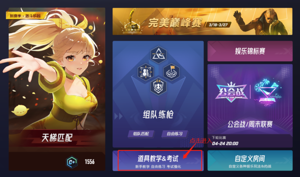 2、当我们处于完美竞技平台的任意界面时,点击左侧模块栏中的【玩】,将右侧切换成游玩模式选择界面后,即可在偏下方看到【道具教学&考试】按钮,点击同样可以进入投掷物练习区。