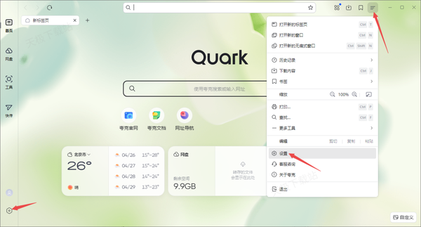 1、启动浏览器,点击界面左下角的【齿轮】图标,或者是点击界面右上角的【三】图标,再选择【设置】选项。