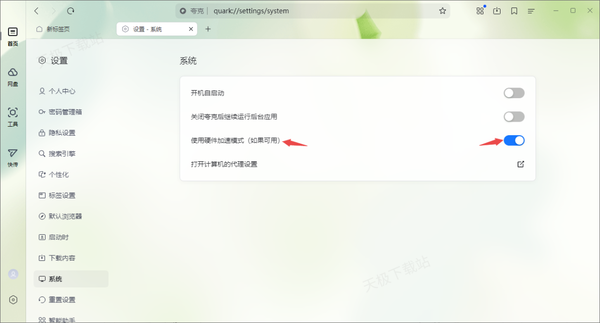 3、最后,在右侧的系统设置界面中,找到【使用硬件加速模式(如果可用)】功能,并将此功能右侧的开关滑动打开即可。