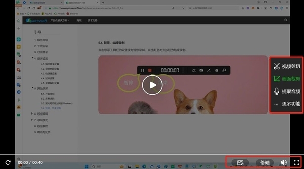 7、在视频的播放窗口右下方的功能图标有字幕设置,倍速播放,全屏观看等,视频画面的右侧还具备裁剪,剪切和音频提取等功能,总之这款软件的各项功能还是很强大的。