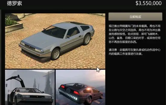与斯特龙伯格相似,德罗索的出现,也是致敬电影,只不过德罗索是致敬《回到未来》中的科幻车。对于这款载具,相信大家要是玩过线上模式,一定都在任务中体验过它,特别是在填上飞的时候,简直是酷毙了。另外,德罗索是可以加装攻击性武器的,这会让它变得非常恐怖,如果玩家操控技术得当,使用德罗索在空中和战斗机“狗斗”可不成问题!