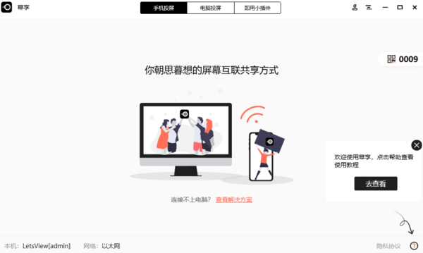 幕享支持Windows、iOS苹果、安卓等多平台使用,是一款免费无线投屏应用程序,支持手机投屏电脑,大屏观看手机上的影视资源、相册、游戏应用等,投屏后还支持白板涂鸦、全屏显示、截图录屏等功能。