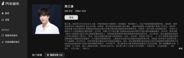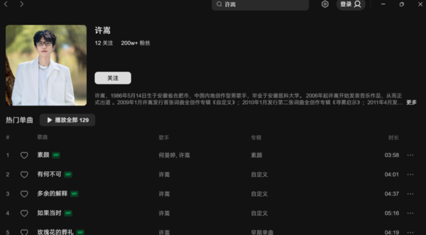 3,以下是在汽水音乐搜索许嵩和薛之谦所展示出的热门歌曲,其中显示许嵩共有热门单曲129首,薛之谦热门单曲共有135首。