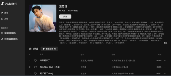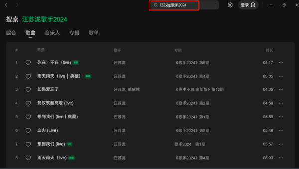 2,在汽水音乐中,我们直接搜索“汪苏泷”就可以查询到他的众多优秀作品了,如下图所示,在搜索框中输入“汪苏泷歌手2024”还可以查询到他在这个音乐综艺上的众多作品,方便大家一键收听,是不是非常方便呢。