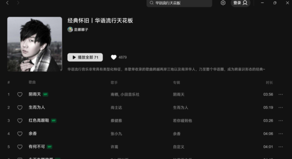 5,下图是作为华语音乐天花板的流行音乐歌单,里面收录了林俊杰,蔡健雅,许嵩等一众优秀歌手的热门歌曲,我们无需挨个搜索他们的作品,听这一个歌单就满足了我们的所有喜好。
