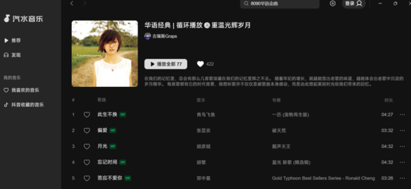 1,如果想找寻8090年代火爆的华语金曲,推荐大家在抖音出品的汽水音乐播放器上进行搜索收听。下图截取了华语乐坛收录的众多优秀作品的歌单,供大家播放。