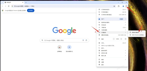 2.打开 谷歌浏览器,然后依次点击右上角三个点→“扩展程序”→“管理扩展程序”。