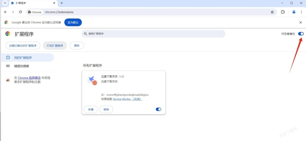 3.在“扩展程序”页面右上角,将“开发者模式”开关切换至开启状态。