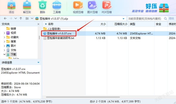 4.接着我们打开豆包插件官网下载的压缩包,把“豆包插件 v1.0.37.crx”解压到电脑上。