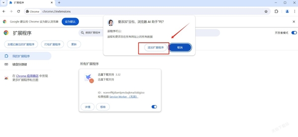 6.这时,我们会看到一个弹出框,点击添加扩展程序,豆包插件就会导入到谷歌浏览器中了。