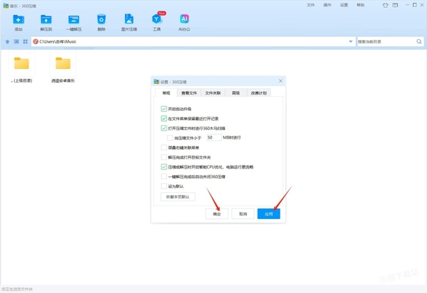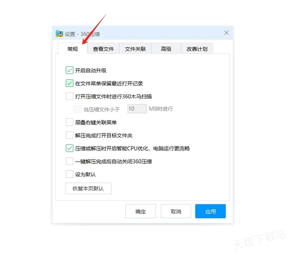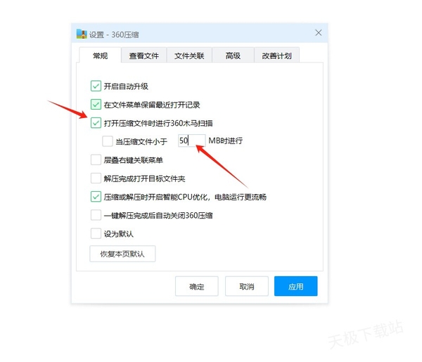 3.在常规设置页面中,找到“打开压缩文件时进行360木马扫描”这一选项,并勾选上它。我们还需要将“当压缩文件小于10MB时进行”中的10MB改成50MB,以便在打开较大压缩文件时也能进行病毒扫描。
