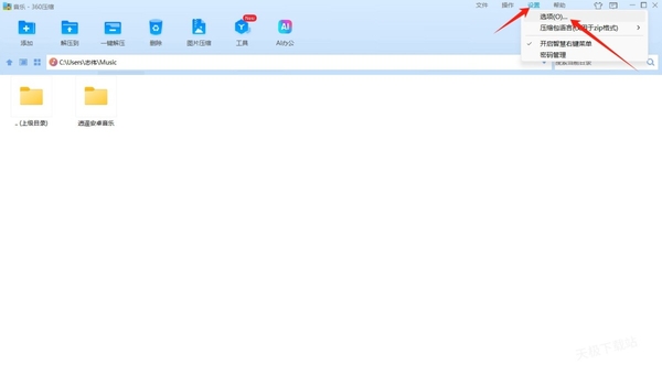 1.首先,我们打开360压缩,在360压缩的主界面上,会看到右上角有一个“设置”选项。点击它,并在下拉菜单中选择“选项”。