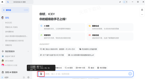 1.打开豆包,点击对话框左边的“回形针”选项。