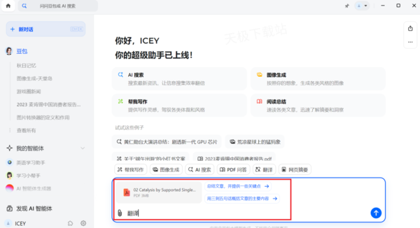 3.在对话框输入“翻译”然后发送,即可开始翻译。也可以输入其他的要求比如“总结文献”或“用三句话概括文章关键点”。