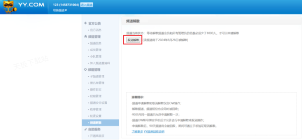 YY语音频道注销是可以撤回的,频道创建者可以在90天以内,通过手机验证码取消注销,不过90天只允许申请注销一次,具体方法如下。