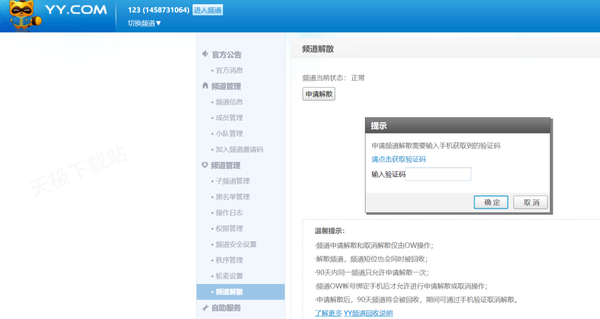 2.点击“取消解散”,获取并输入手机验证码,即可撤回频道注销。注意:同一个频道,在90天内仅能申请注销一次。