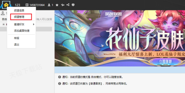 2.点击进入自己创建的频道,点击左上角图标,选中“频道管理”。