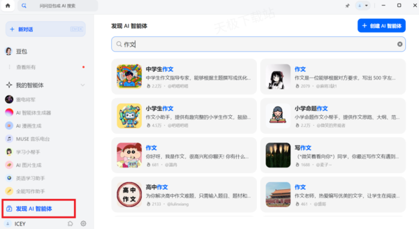 在首页点击左侧“发现AI智能体”,在上方搜索需要的文案类型即可,比如“作文”,可以看到有非常多关于“作文”的AI生成功能,比如中小学生作文、满分作文等,大家按需选择即可。
