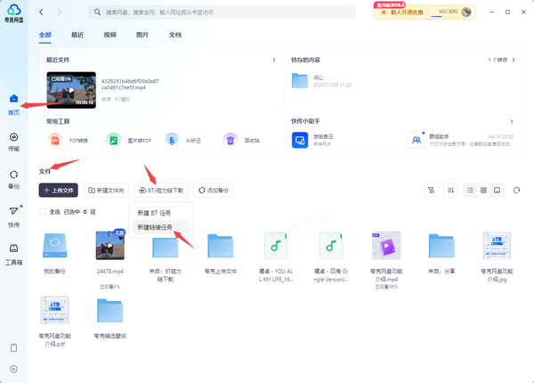 1、在夸克网盘的首页界面中,找到【文件】选项下的【BT/磁力链下载】按钮,点击它。然后选择【新建链接任务】选项。