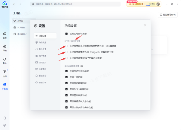 2、然后在默认的【功能设置】界面的右侧,找到【BT/磁力接管设置】选项,将它下方的【允许夸克自动识别剪切板中的磁力链、http等链接】、【允许夸克接管磁力链(magnet)的解析和下载】以及【允许夸克接管BT种子的解析和下载】这3个选项全部进行勾选即可。