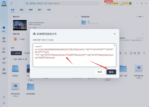 2、最后,在新建离线链接任务弹窗中,输入好友给的BT资源链接,然后点击【确认】按钮。