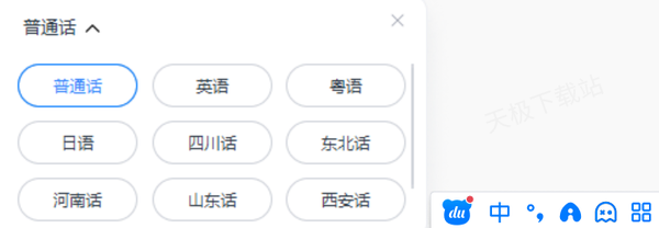 将电脑输入法调成百度输入法后,点击右侧四个方块“工具箱”,选择“语音输入”,然后点击左侧“普通话”即可更改语言类型,支持粤语、四川话、东北话、河南话、山东话、西安话、合肥话、英语、日语的语音识别。