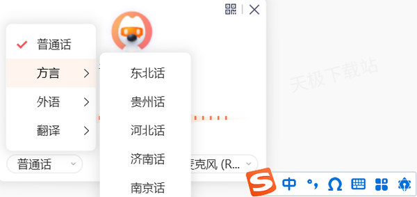 将电脑输入法调成搜狗输入法后,右键点击“语言输入”,点击左侧“普通话”即可更改语言类型,支持广东话、天津话等10种方言,以及9种外国语言的识别,同样也拥有翻译功能。