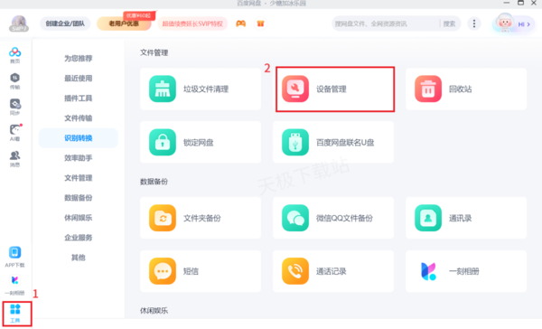 1.在百度网盘客户端,点击左下角“工具”,然后往下划找到“设备管理”,点击打开。