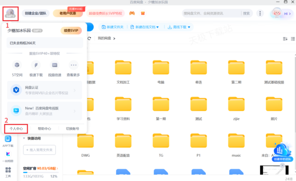 1.打开百度网盘客户端,鼠标划到左上角头像处,点击左下角“个人中心”。