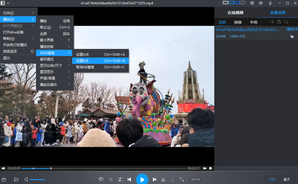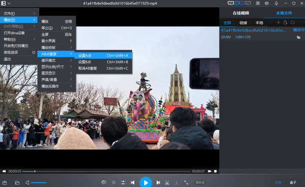 1.打开目标视频后,将视频暂停在重复片段的起点,点击左上角框住的选项,依次选择“播放”-“AB点重复”-“设置A点”。