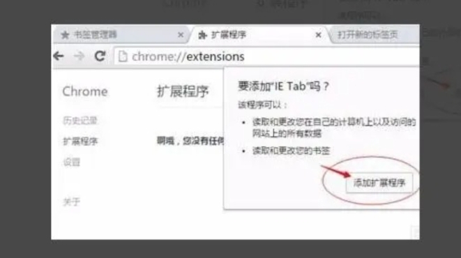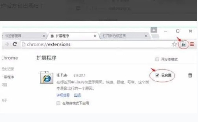 1、打开google浏览器,点击右上角的三个点图标,然后选择“扩展”,然后“打开Chrome网上应用店”,搜索“ie tab multi”或“ie tab”,找到相应的扩展程序,点击“免费”按钮进行安装。