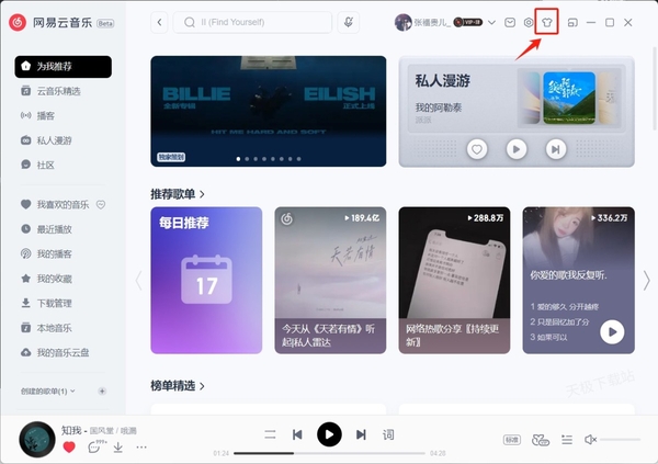 1.首先,打开网易云音乐电脑版,在右上角看到一个类似衬衫的图标,点击这个图标,就来到了皮肤设置页面。