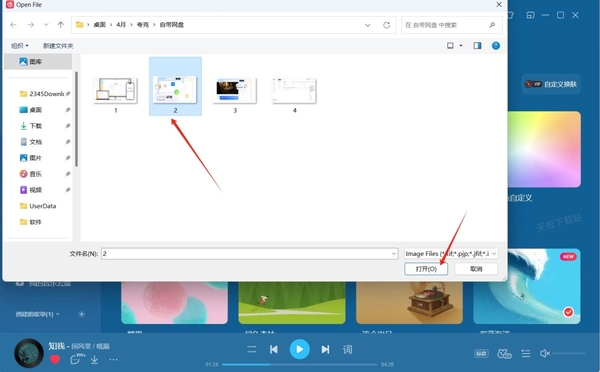 2.在自定义皮肤页面,需要选择一张电脑上的图片作为你的皮肤,选择好了点击“打开”按钮。