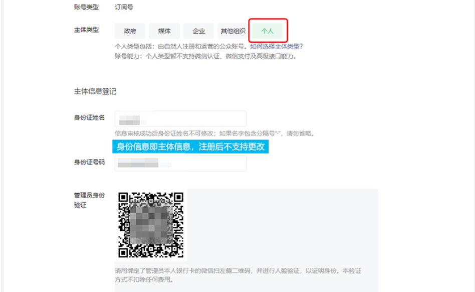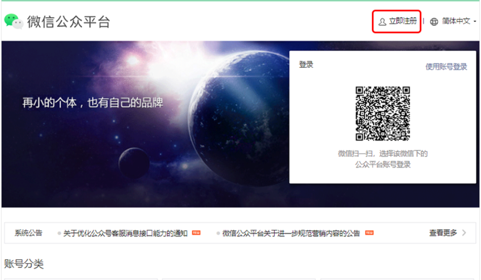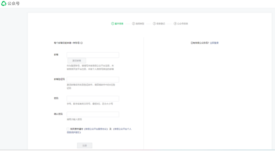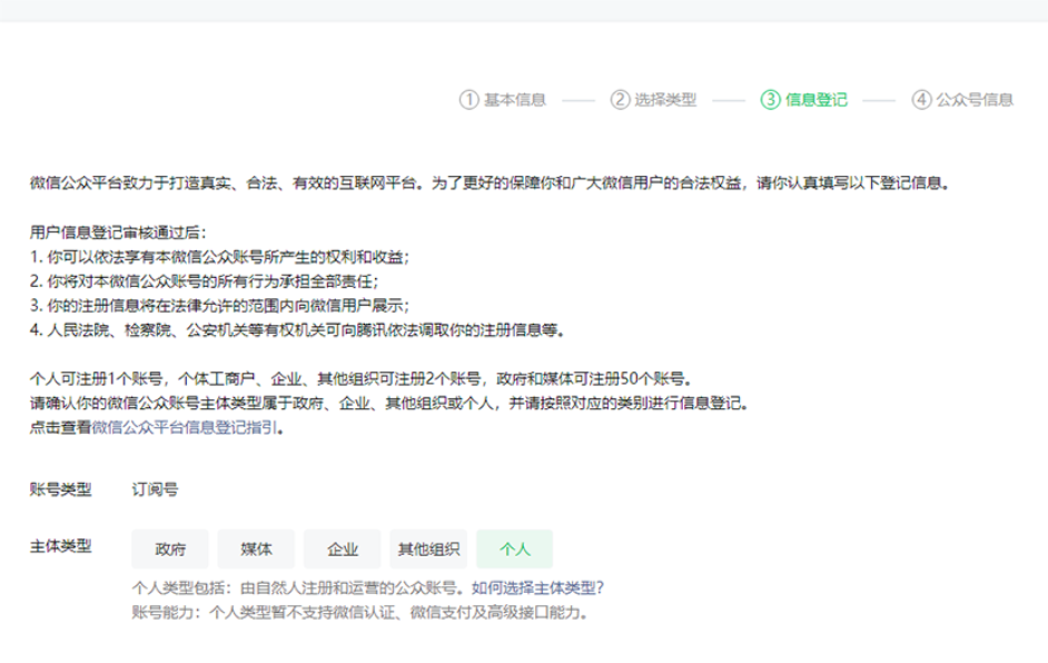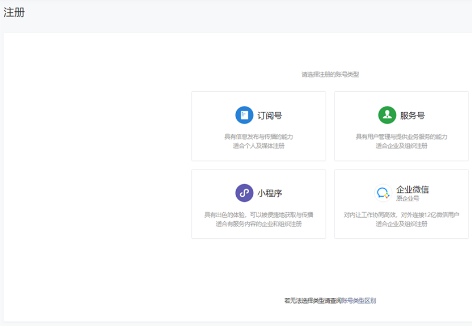 了解订阅号、服务号和企业微信的区别,选择账号类型(个人仅支持注册订阅号)