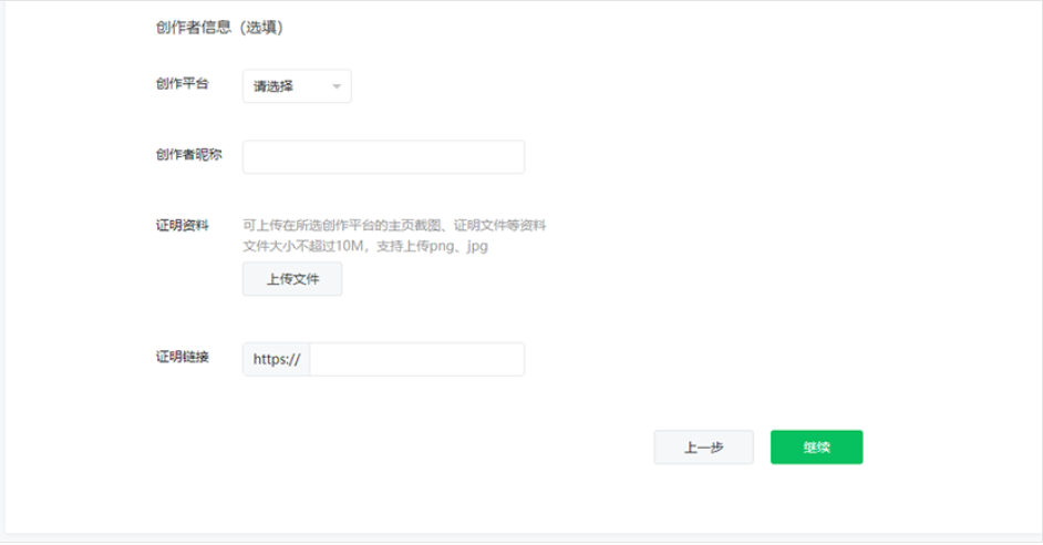 填写创作者信息,点击继续(如使用过其他内容创作平台,可填写相关信息。如没有,可无需填写。无论是否填写,对账号后续使用不会有影响)