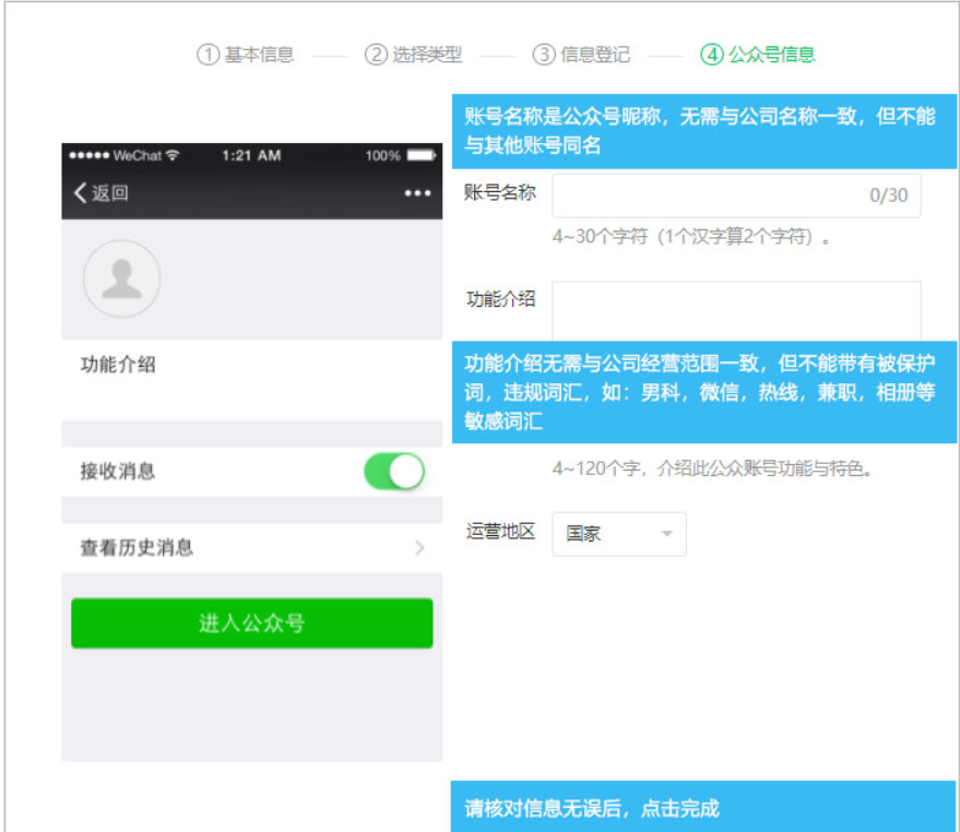 4、填写账号信息,包括公众号名称、功能介绍,选择运营地区