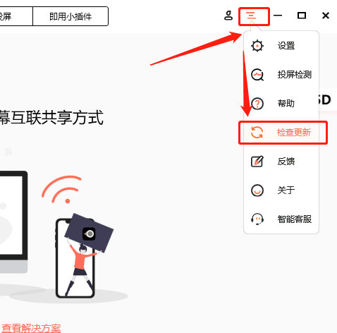 其次,如果是电脑端幕享版本过低的话,也是有可能会无法进行连接的,我们可以手动更新一下幕享的版本。点击如下图所示的按钮,然后在菜单中选择“检查更新”,如果需要更新的话按照提示升级版本即可。