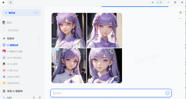 2.点击下方“智能体”,可以看到豆包细分的几种AI功能,有音乐电台、AI图片生成、AI漫画生成、英语学习助手等功能,拿AI漫画生成举例。