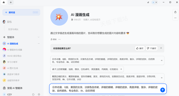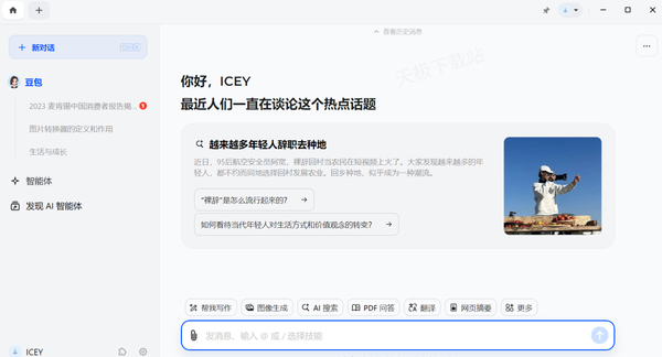 豆包是字节跳动公司抖音旗下的AI智能工具,可以帮助用户进行AI写作、对话、翻译、学习,还提供了丰富的娱乐功能,比如AI生成图片、AI虚拟女友等。除了自带的AI功能,豆包还支持用户自己创建属于自己的AI工具——AI智能体,没有任何上手门槛,无需收费,只需输入自己的想法,无论是AI智能体的创建,还是回答各种问题,都可以轻松做到。