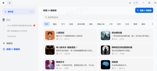 3.点击下发“发现AI智能体”可以使用别人创建分享的AI工具,细分各种领域,包括学习、绘画、动漫、工作、情感等,所有的AI智能体使用方法都相同,只需输入简单的指令即可。