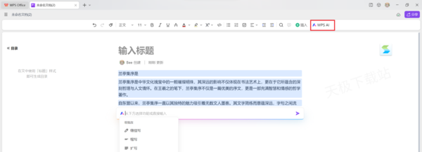 1.如果是在普通文档,我们可以直接输入“@ai”然后敲击回车键,唤醒WPS智能助手。