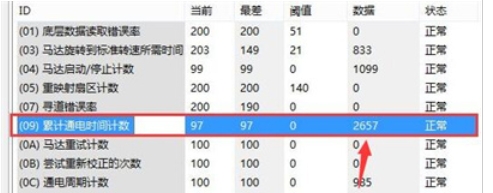 在“健康状态”界面中,找到“累计通电时间计数”这一项。这里显示的就是硬盘的使用时间,通常以小时或天数为单位。