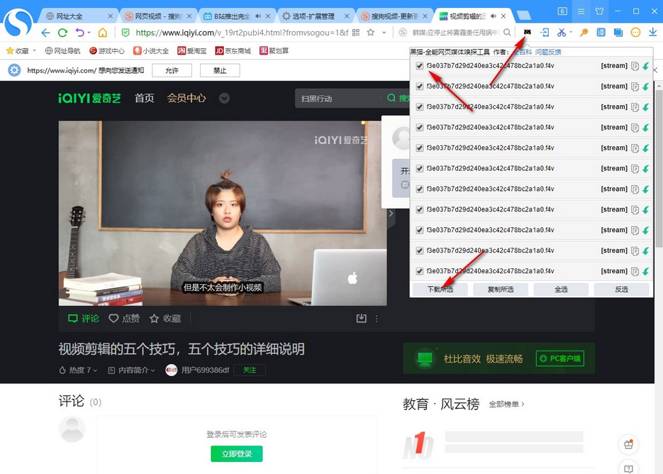 5.添加完成之后,该插件就会显示在右上角的工具栏中,然后将需要下载的网页视频点击打开,在右上角点击刚刚下载的插件,就会弹出需要下载的视频,将视频勾选上,然后点击【下载所选】按钮。